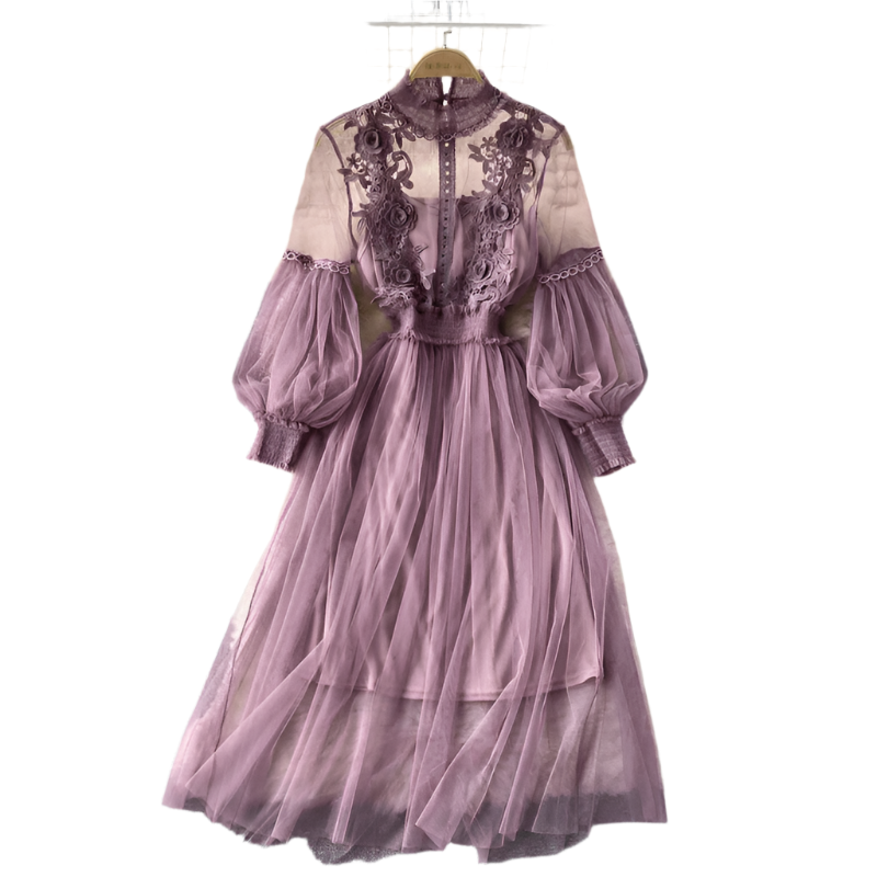 Denne kjole er en tidløs klassiker med et glamourøst præg. Den blomstrede detalje tilføjer en romantisk stemning, mens den høje krave giver et moderne og stilfuldt udtryk. Uanset om du skal til et bryllup eller en fest, vil denne kjole sikre, at du skiller dig ud.