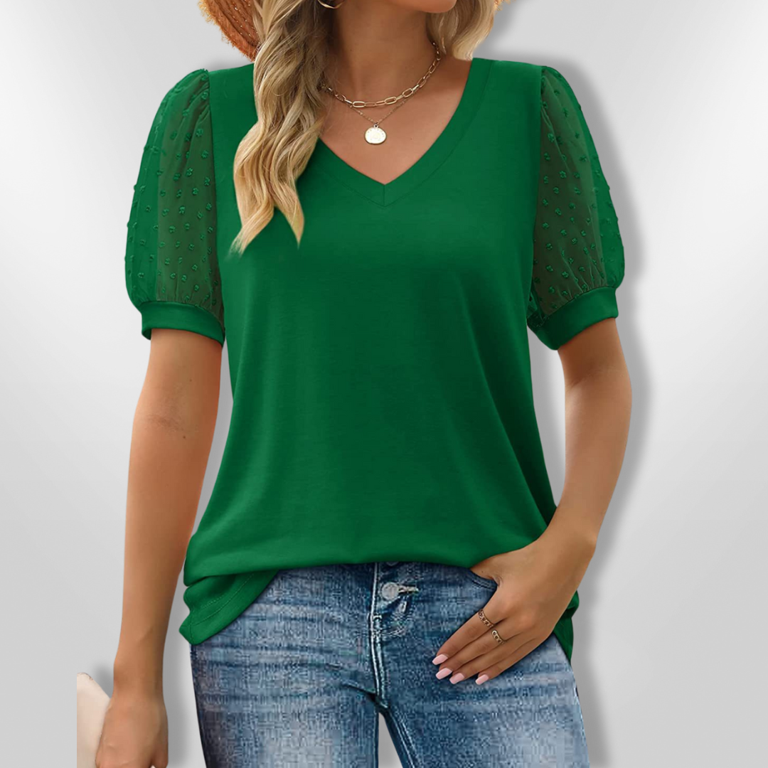 Designet med et klassisk V-hals og elegante puffærmer, tilføjer denne bluse et feminint touch til din garderobe. Den er ideel til både afslappede og mere formelle begivenheder, hvilket gør den til et alsidigt valg.