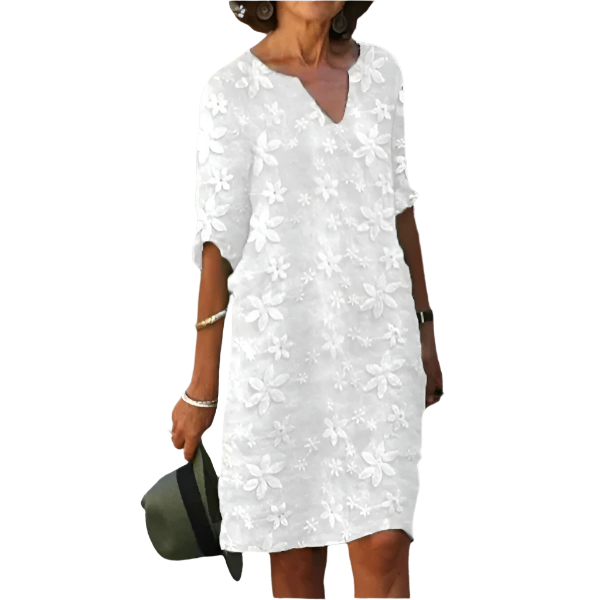 Denne kjole har et raffineret blomsterdesign, der tilføjer liv til dit look og sikrer, at du skiller dig ud ved enhver lejlighed. Den behagelige pasform og det velventilerede stof giver dig fri bevægelse, mens den bevarer en stilfuld silhuet.