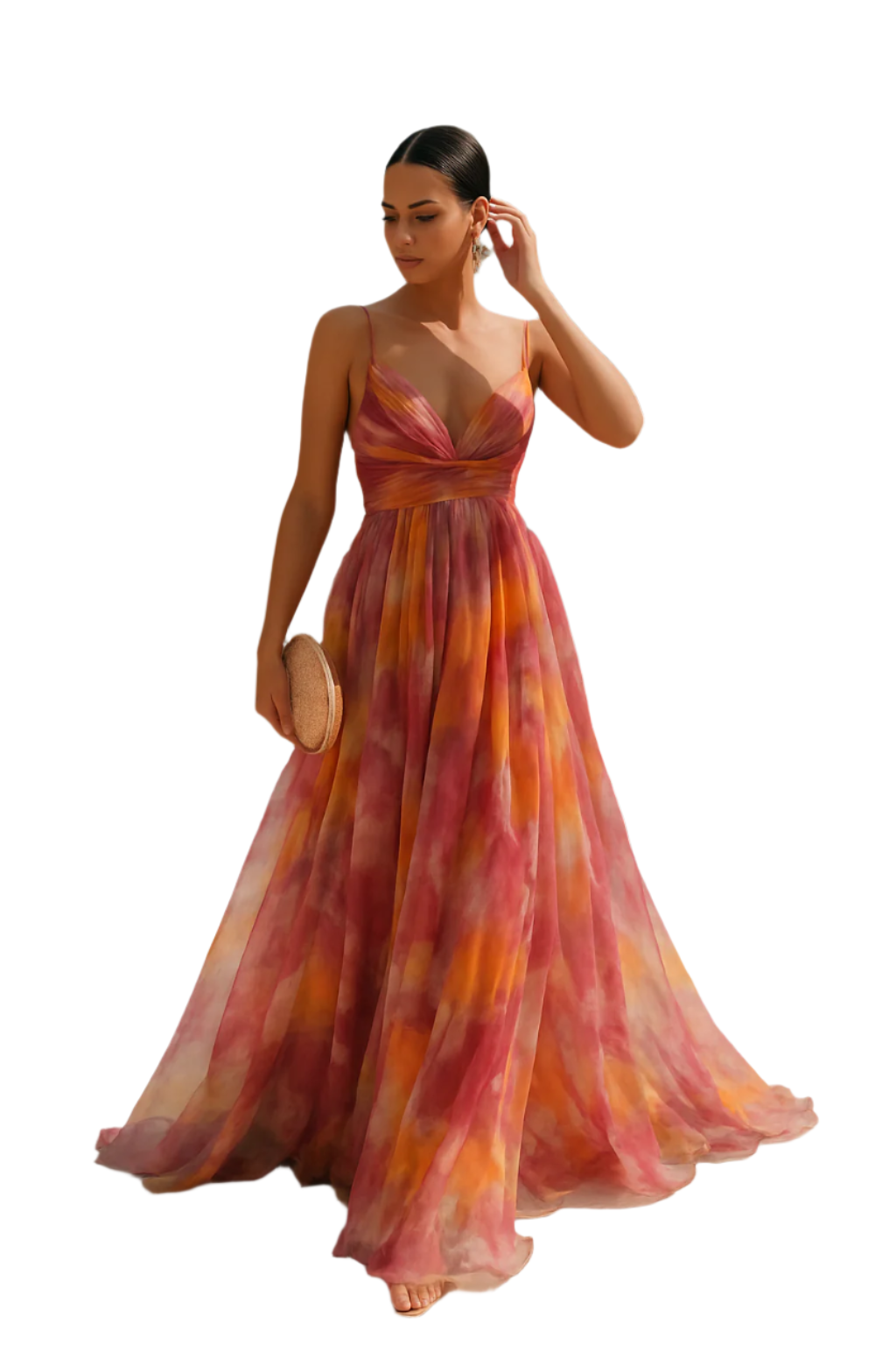 Denne kjole er perfekt til sommerens begivenheder, fra picnics til festlige lejligheder. Den lette og luftige fornemmelse gør den ideel til varme dage, mens det farverige print tilføjer et livligt element til din garderobe.