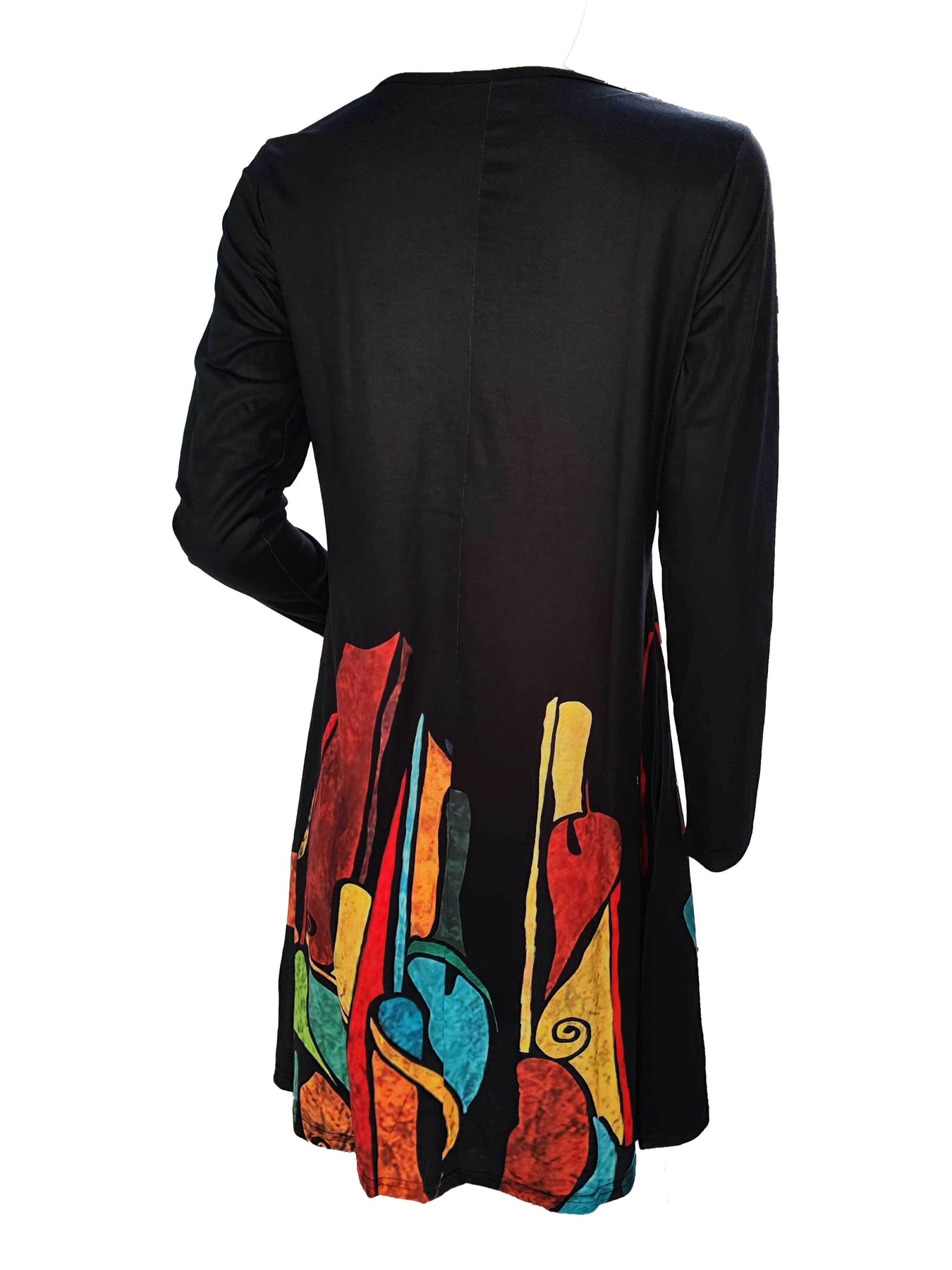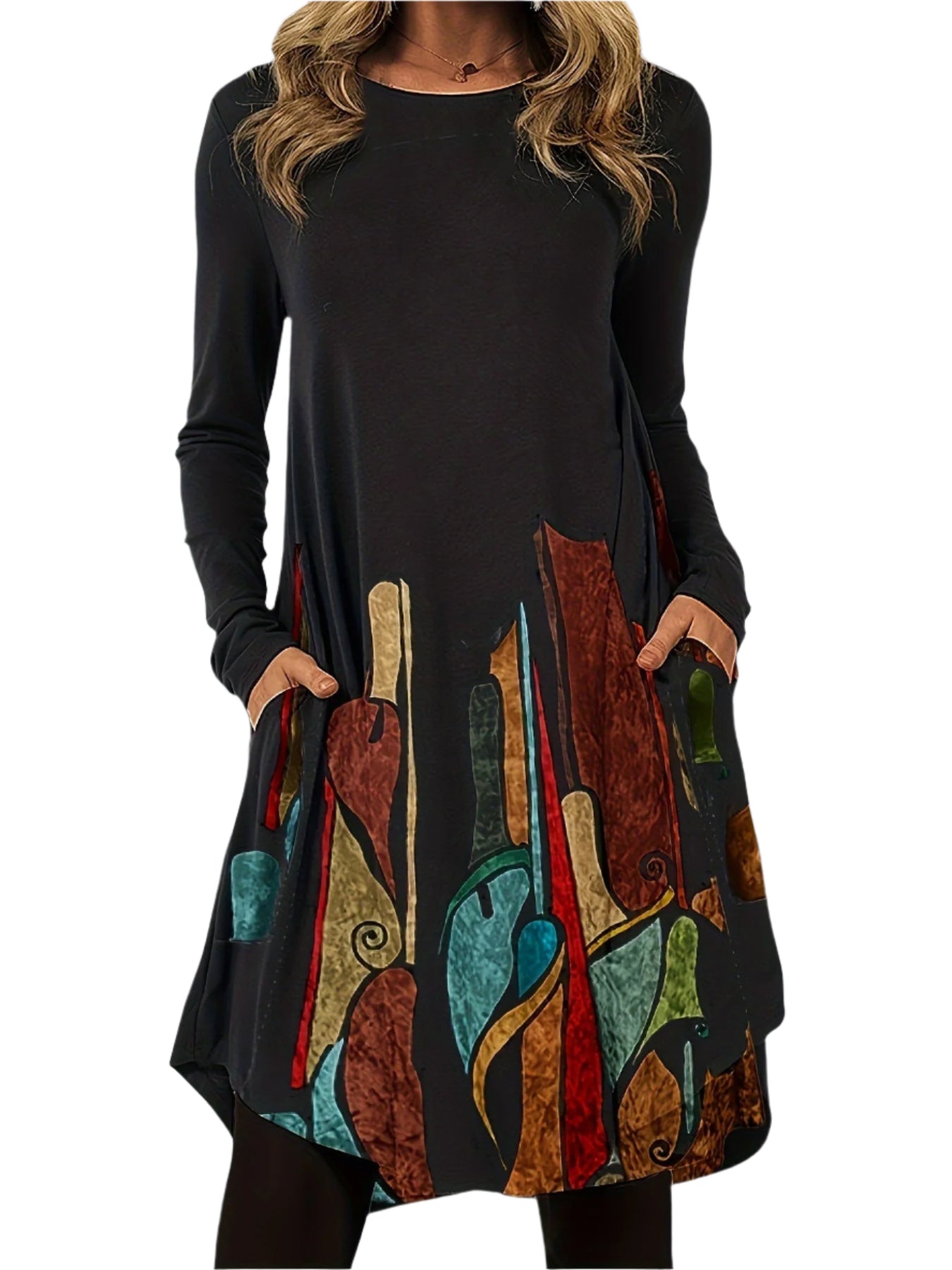 Med unikke prints og et blødt, strækbart stof, tilbyder denne kjole både kunstnerisk flair og dagligdags komfort. Den er ideel til at skabe et stilfuldt look, uanset om du skal til fest eller en afslappet dag ude.
