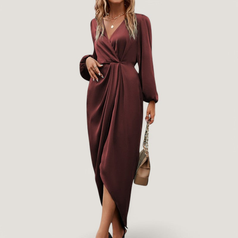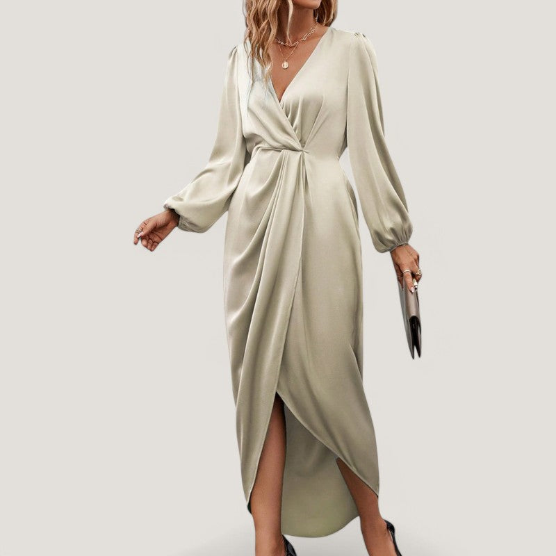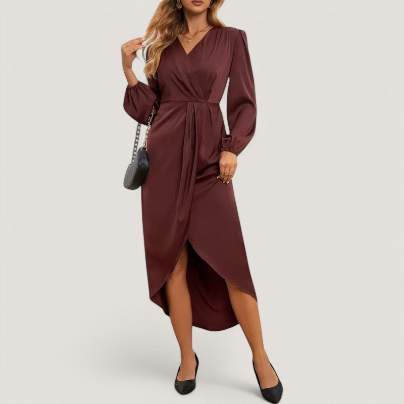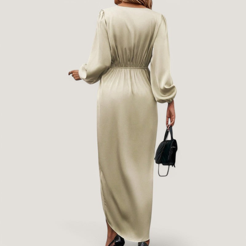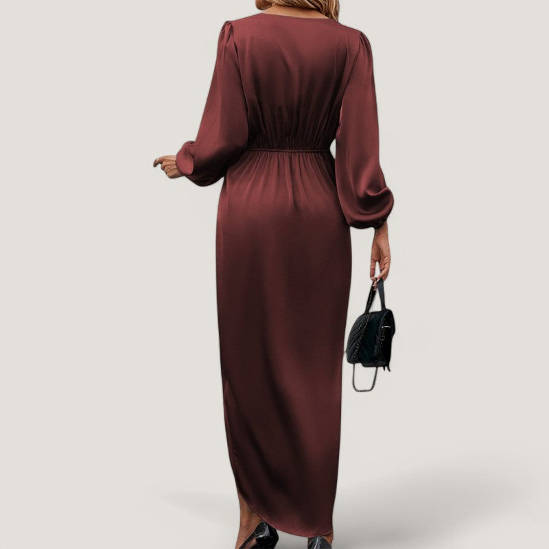 Med sin flatterende A-silhuet og elegante V-hals, fremhæver kjolen din figur på en smuk måde. De stilfulde ballonærmer tilføjer et unikt præg, der gør denne kjole til et ideelt valg til både formelle og uformelle begivenheder.