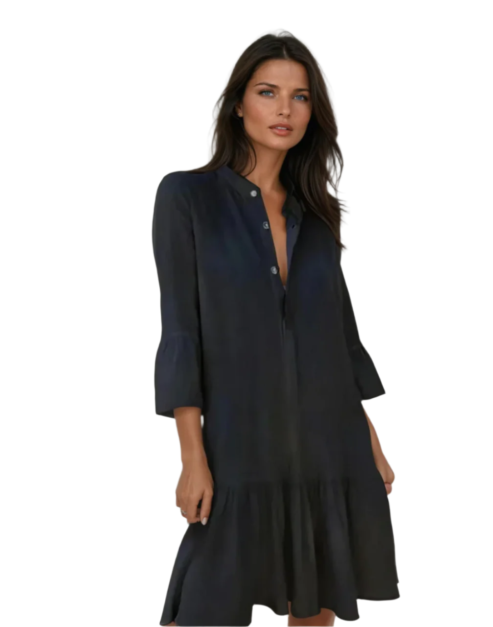Denne kjole har en tidløs skjortekjole-design, der giver en struktureret, men feminin silhuet. Den lette og åndbare stof sikrer komfort hele dagen, mens de plisserede detaljer tilføjer bevægelse og elegance.