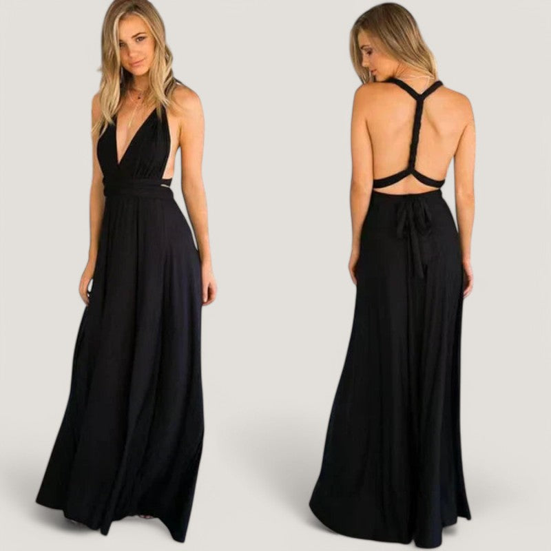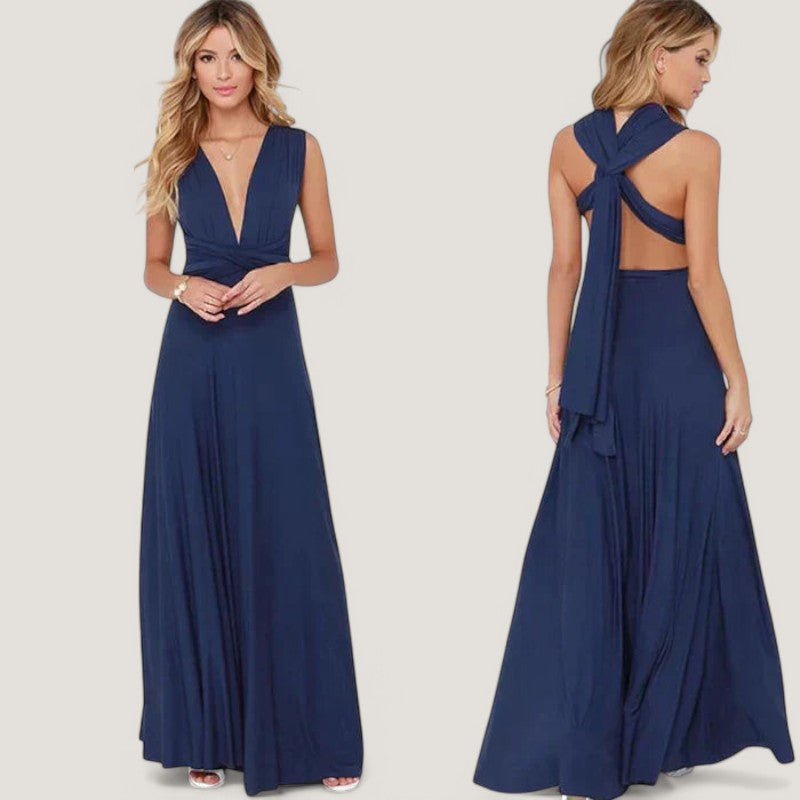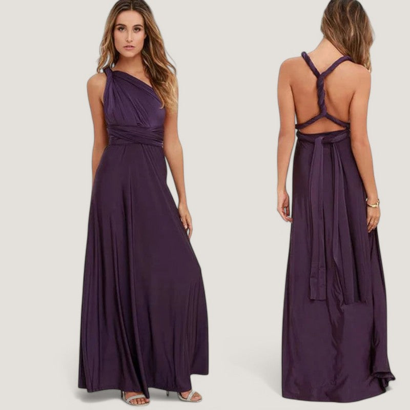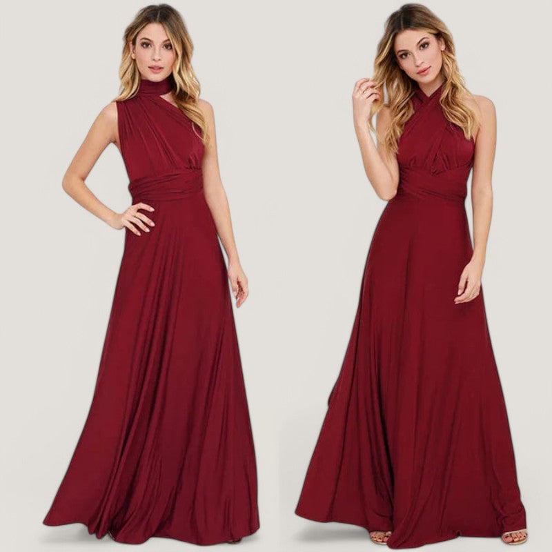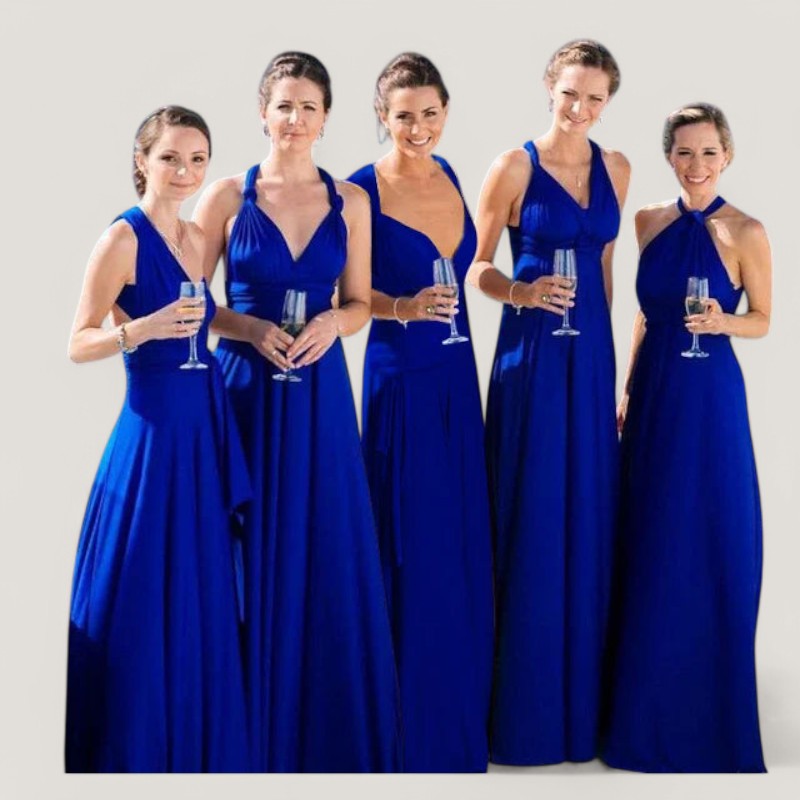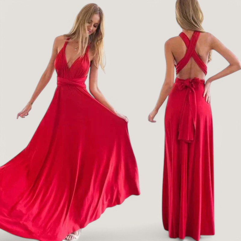 Kjolen har et tidløst design, der gør den velegnet til mange forskellige anledninger. De lange bånd giver mulighed for at bære kjolen på mere end 20 forskellige måder, hvilket gør den til en alsidig tilføjelse til din garderobe. Den plisserede talje og de delikate detaljer tilføjer et strejf af raffinement til dit look.