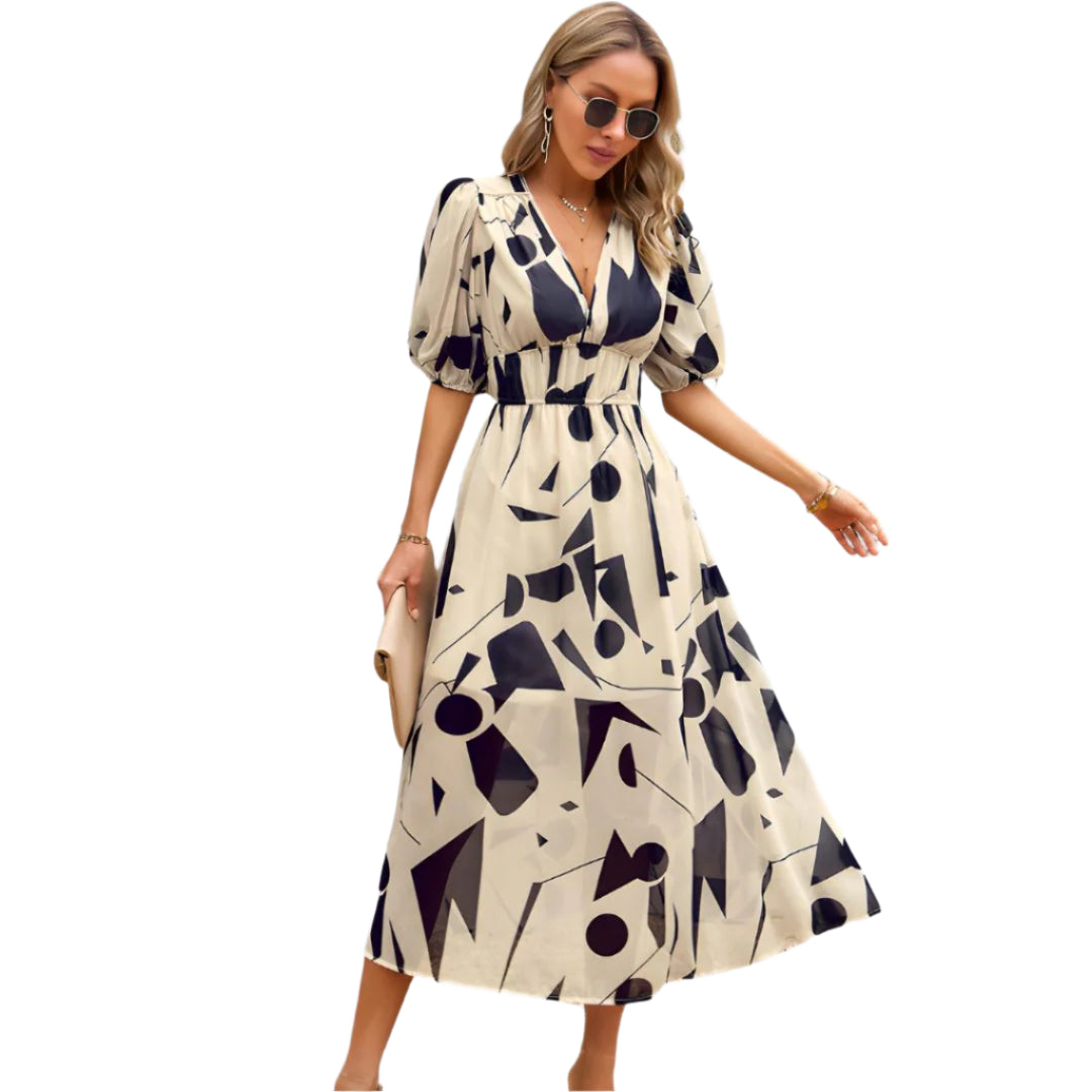 Denne kjole er designet med fokus på både æstetik og funktionalitet. Den elegante V-hals fremhæver din silhuet, mens det alsidige look gør den perfekt til både afslappede og mere formelle begivenheder.