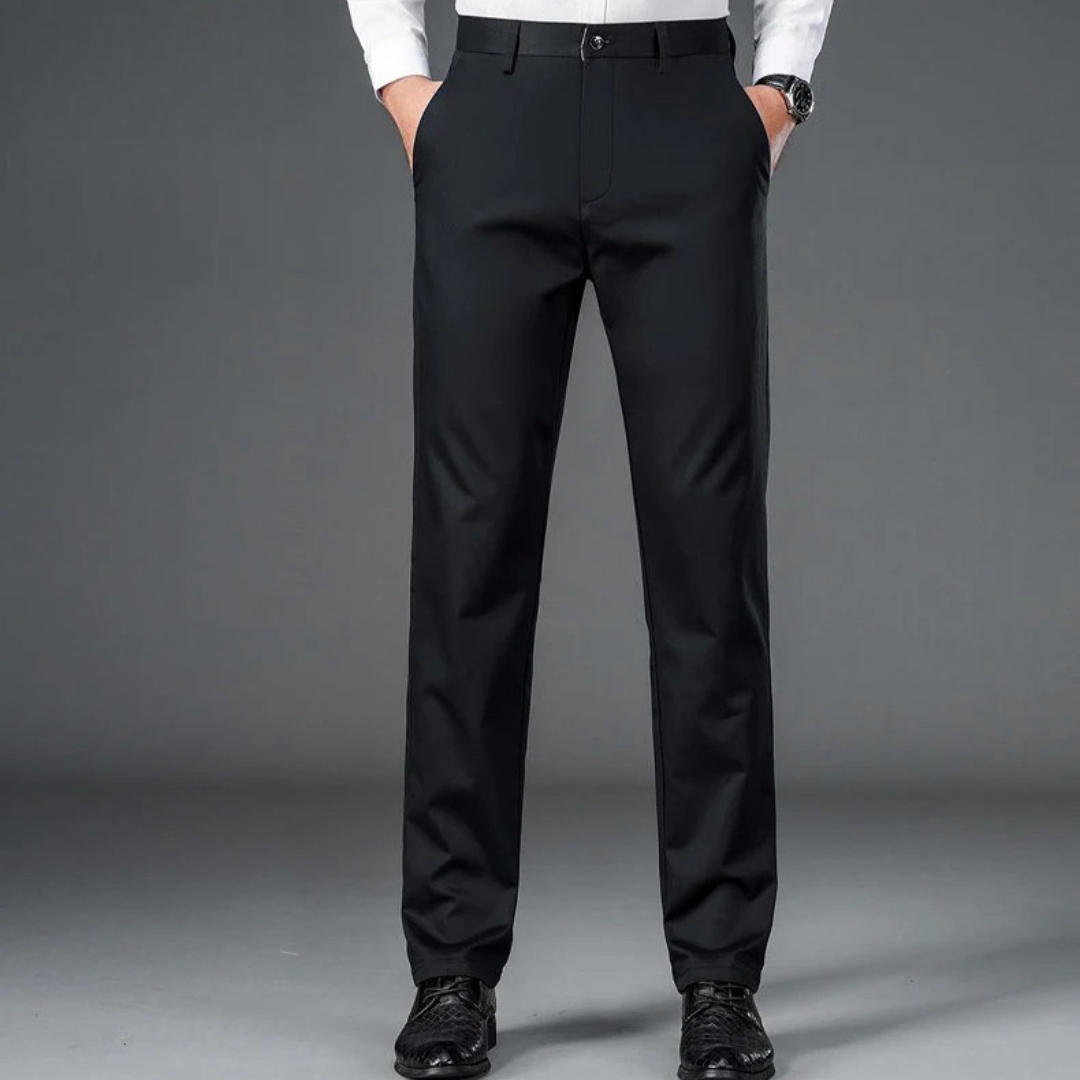 Disse smarte casual bukser til mænd kombinerer det rene look fra kontorbukse med fleksibiliteten fra stretchmateriale og hurtigtørrende egenskaber. De er designet i ensfarvet sort og har en moderne pasform, der passer til både professionelle og hverdagsagtige omgivelser.