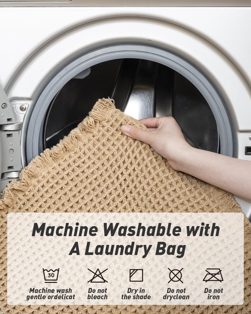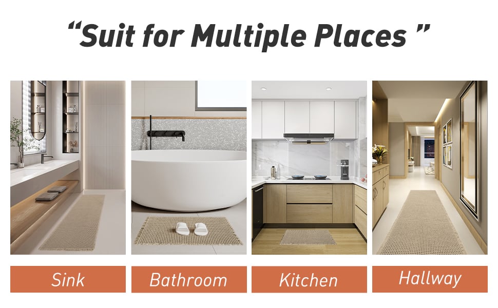 Med sin unikke vaffelstruktur og skridsikre bagside er dette tæppe ideelt til brug i badeværelset, køkkenet eller gangen. Det hurtigtørrende materiale sikrer, at det forbliver friskt og funktionelt, selv i fugtige omgivelser.
