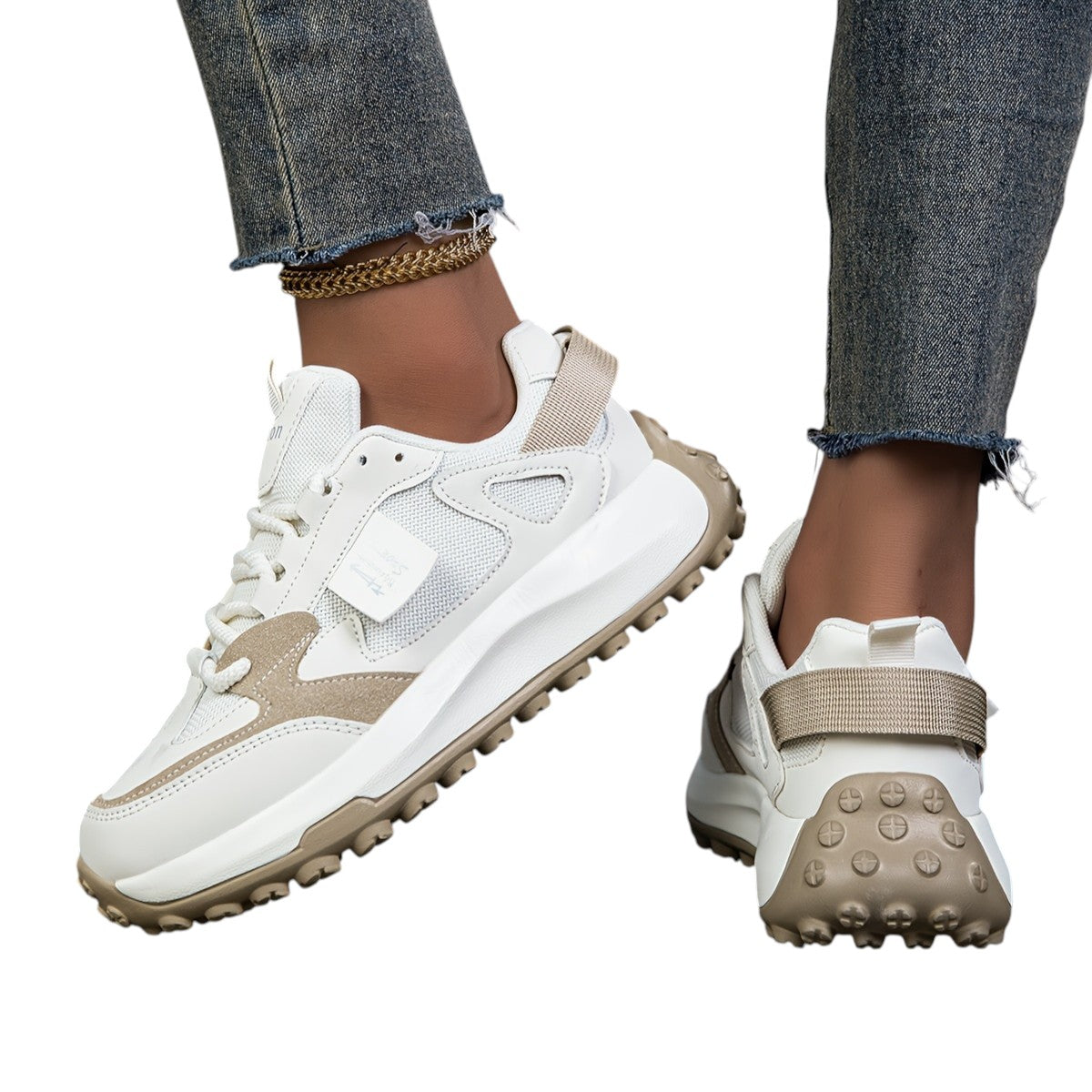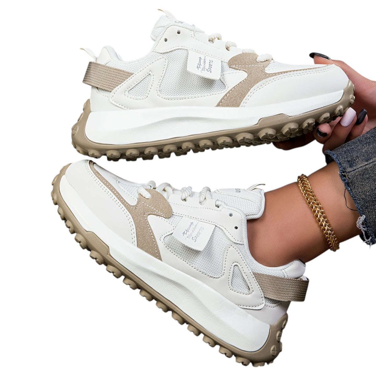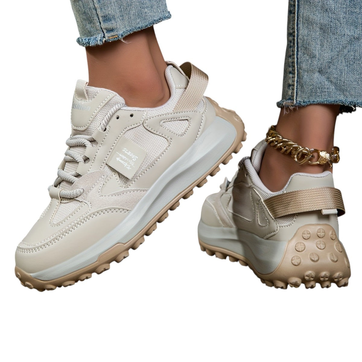 Disse sneakers har en robust sål, der ikke kun tilføjer højde, men også giver støtte hele dagen. Ventilationsmaterialet sikrer, at dine fødder forbliver komfortable, uanset hvor du går.