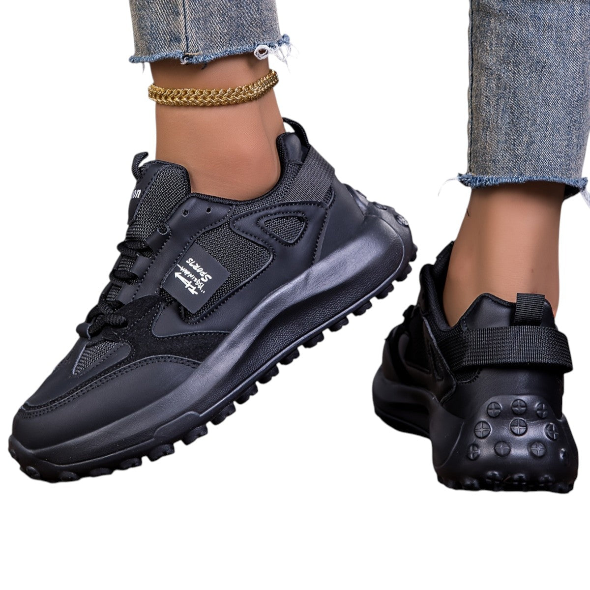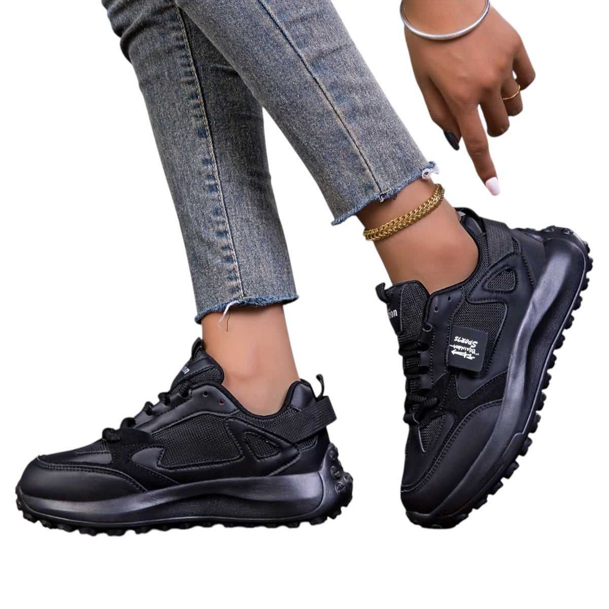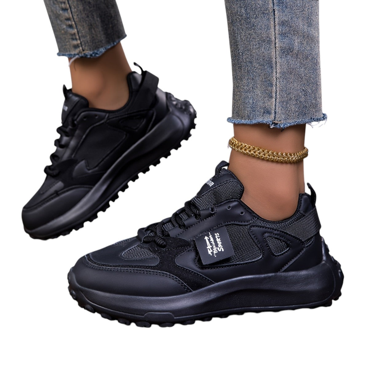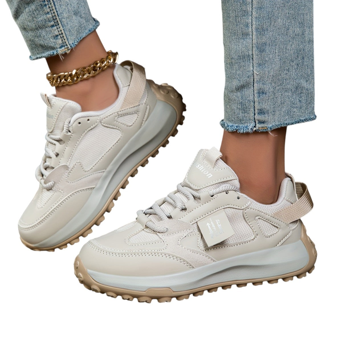 Disse sneakers har en robust sål, der ikke kun tilføjer højde, men også giver støtte hele dagen. Ventilationsmaterialet sikrer, at dine fødder forbliver komfortable, uanset hvor du går.