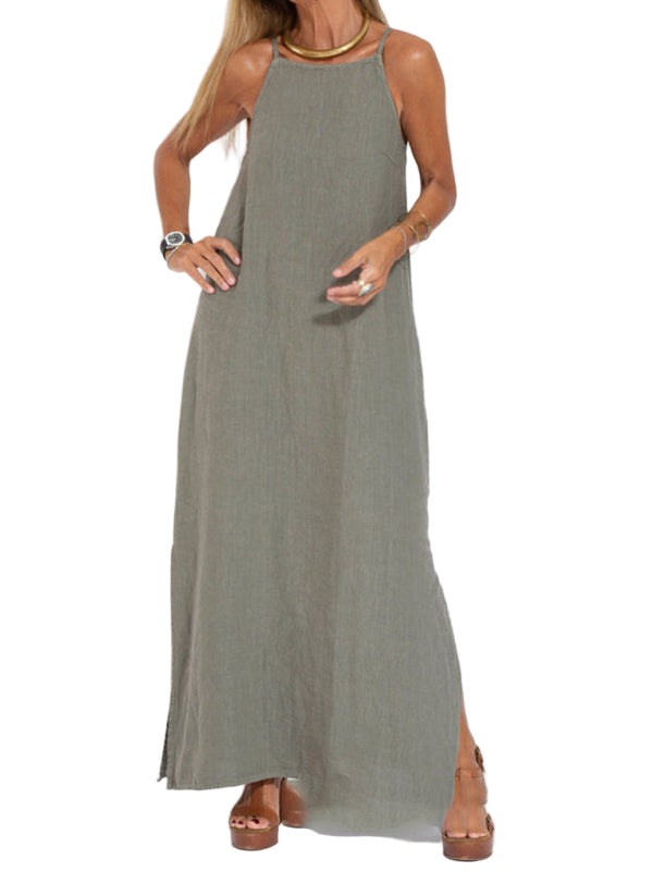 Kvinders Maxi Kjole Spaghetti Stropper i Bomulds-Linned